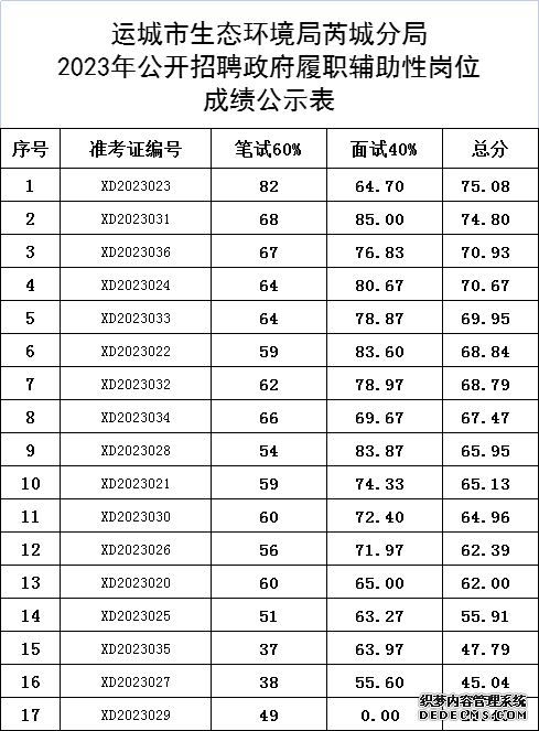 運城市生態環境局芮城分局2023年公開招聘政府履職輔助性崗位工作人員成績公示如下: